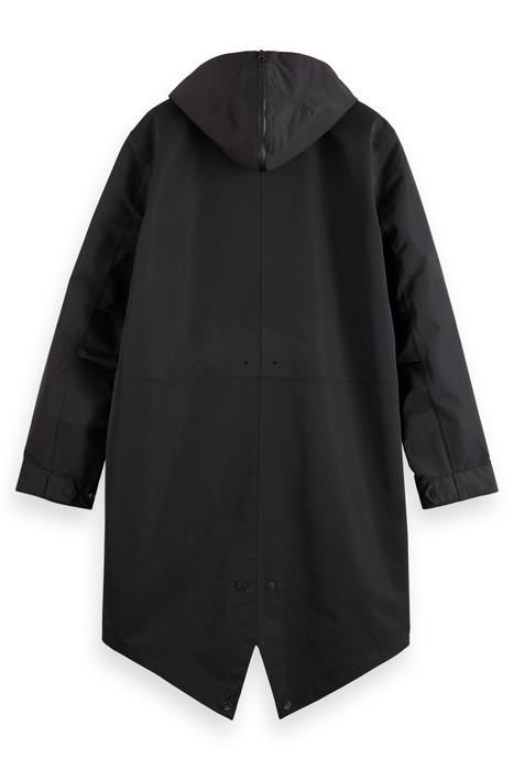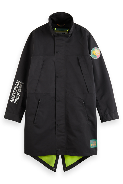 Introducing the Amsterdam Proof Raincoat Parka in Black by Scotch & Soda Org, a must-have addition to your outerwear collection. This sleek and stylish parka is designed to keep you dry and protected from the elements while looking effortlessly chic.
