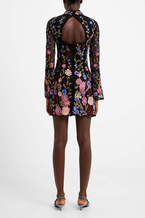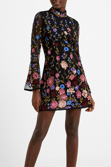 Captivating And Colourful Florals Make Our Astrida Embellished Mini Dress A Captivating Style. This Dress Falls To A Mini Length With A Dreamworth Appearance From A Modish Silhouette Framed By A High Neckline And Sheer Fluted Sleeves To The