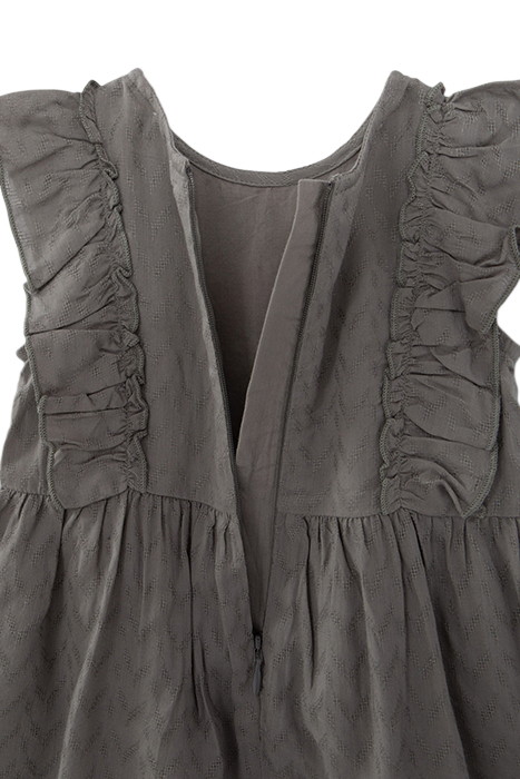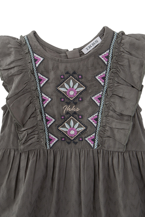 This Baby Girls’ Dress Has Boho Inspiration With A Mix Of Khaki Chevron Motif Jacquard, Ruffles And Ethnic Embroidery On The Dickey.