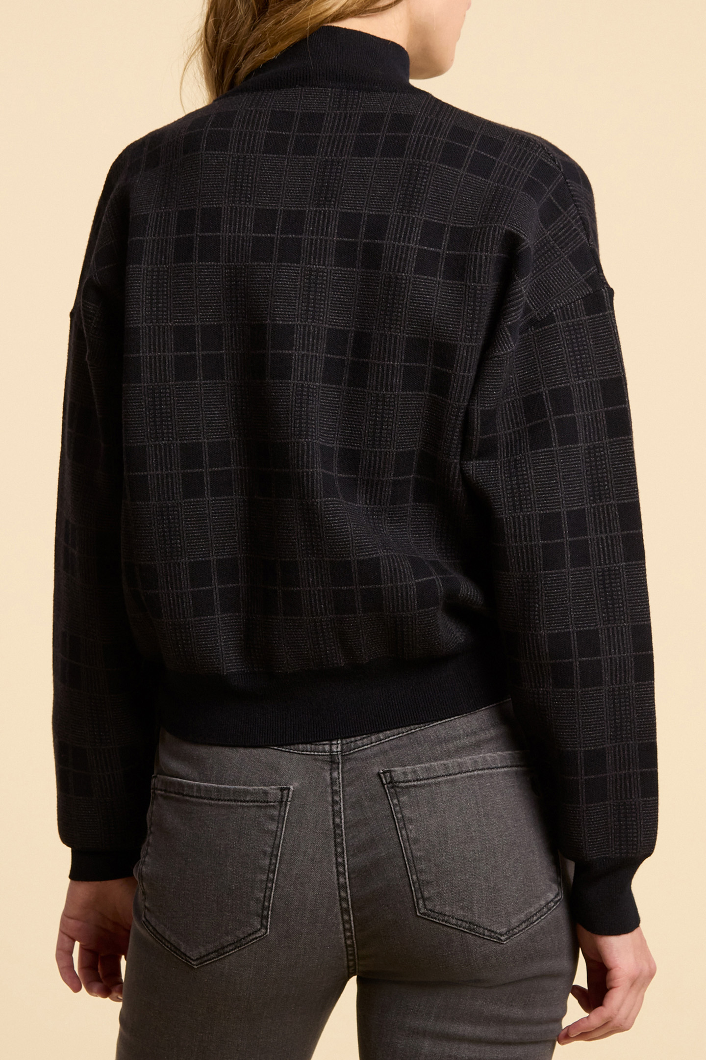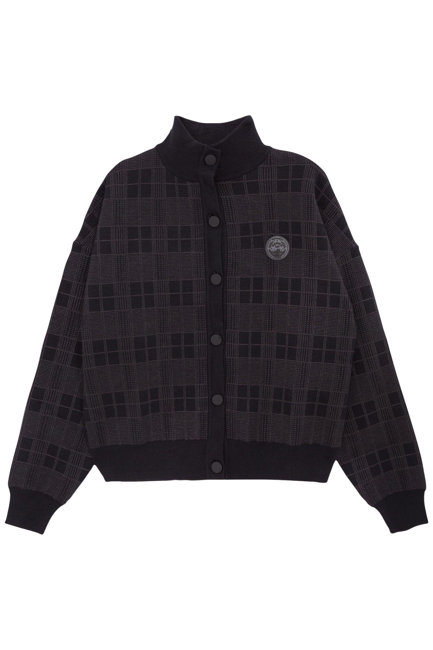 Women’S Black Cardigan. High Collar, Long Sleeves, Dropped Shoulders. Check Jacquard Knit. Exclusive Rubber Badge Designed By I.Code On Chest. 1X1 Ribbing On Neck, Cuffs And Hem. Buttons To Fasten