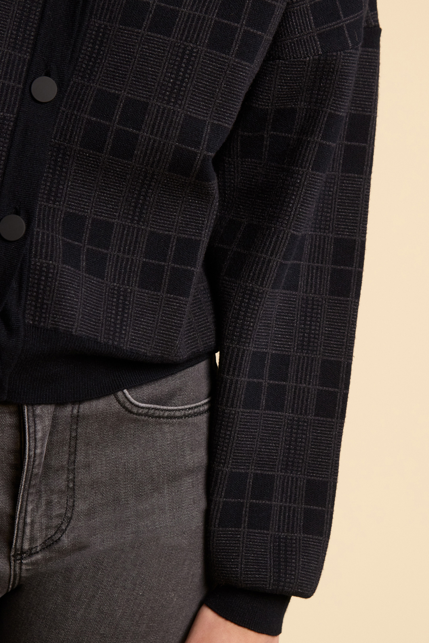BLACK KNIT CARDIGAN WITH CHECK JACQUARD MOTIF