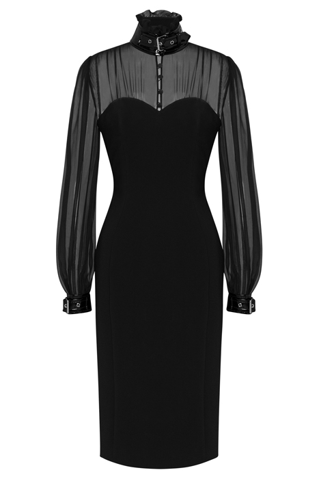 Stretch Viscose Cady Midi Dress With Silk Chiffon Top And Sleeves And Vinyl Details With Adjustable Straps.