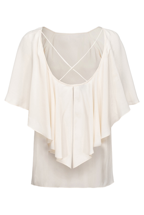 Silk-Blend Crepe De Chine Blouse With Boat Neck And Open Back With Criss-Crossing Shoulder Straps. Straight-Cut Piece With Short, Cape-Effect Draped Sleeves Extending Into A Large Ruffle At The Back. This Piece Is Made From Material – Certified Throughout The Production Chain – From Forests That Are Managed In Accordance With Sustainability Principles. - Model Is 177Cm Tall And Wears A Size 40.