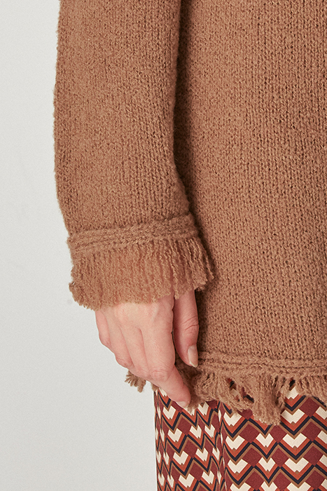 Soft Wool Crew-Neck Cardigan In Bouclé Yarn, Gauge 5, Straight Cut, Stockinette Stitch, Metal Buttons With Double-Breasted Effect, Details With Fringes.