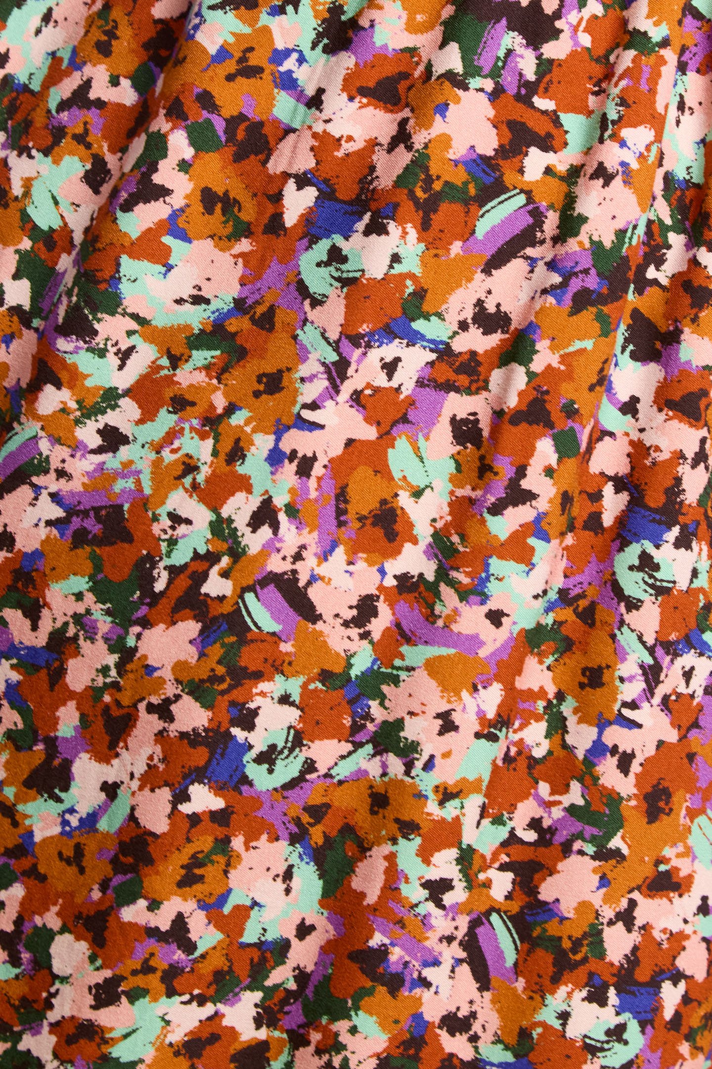 Camel A-Line Dress. V-Neckline, Long Sleeves. Multicoloured Tachist Print, Waist Seaming With Gathers. Drawstring Waist With Cords To Tie. Dress Length: 90 Cm
