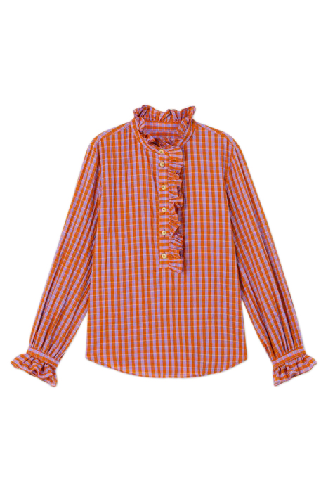 A Striking Shirt Which Instantly Freshens Up Between-Seasons Looks, The Camille Blouse Feels Both Androgynous And Feminine. Crafted In Europe From A Seersucker Cotton Blend French Fabric In Orange And Purple Gingham Checks, It Has A High Collar With A Frill Edge, A Ruffle Trim To The Half Placket Of Horn-Effect Buttons, Long Sleeves With Frill-Edge Cuffs And A Classic Fit. Tuck Into Denim Tailored Trousers For A Playful Seventies-Inspired Feel.