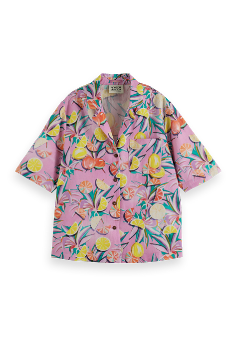 Introducing the Scotch & Soda Camp Shirt with Print in Citrus Squash Orchid, a vibrant and stylish addition to your wardrobe. This eye-catching shirt features a bold citrus squash and orchid print that is perfect for adding a pop of color to your outfit.