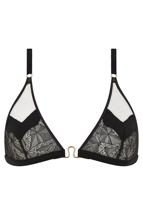 Beugelloze Triangel Bh Met Een Verleidelijk Decolleté. De Cups Zijn Voorzien Van Leaverskant, Ondoorzichtig Breisel En Transparante Tule, Voor Een Opvallend Spel Van Contrasten.