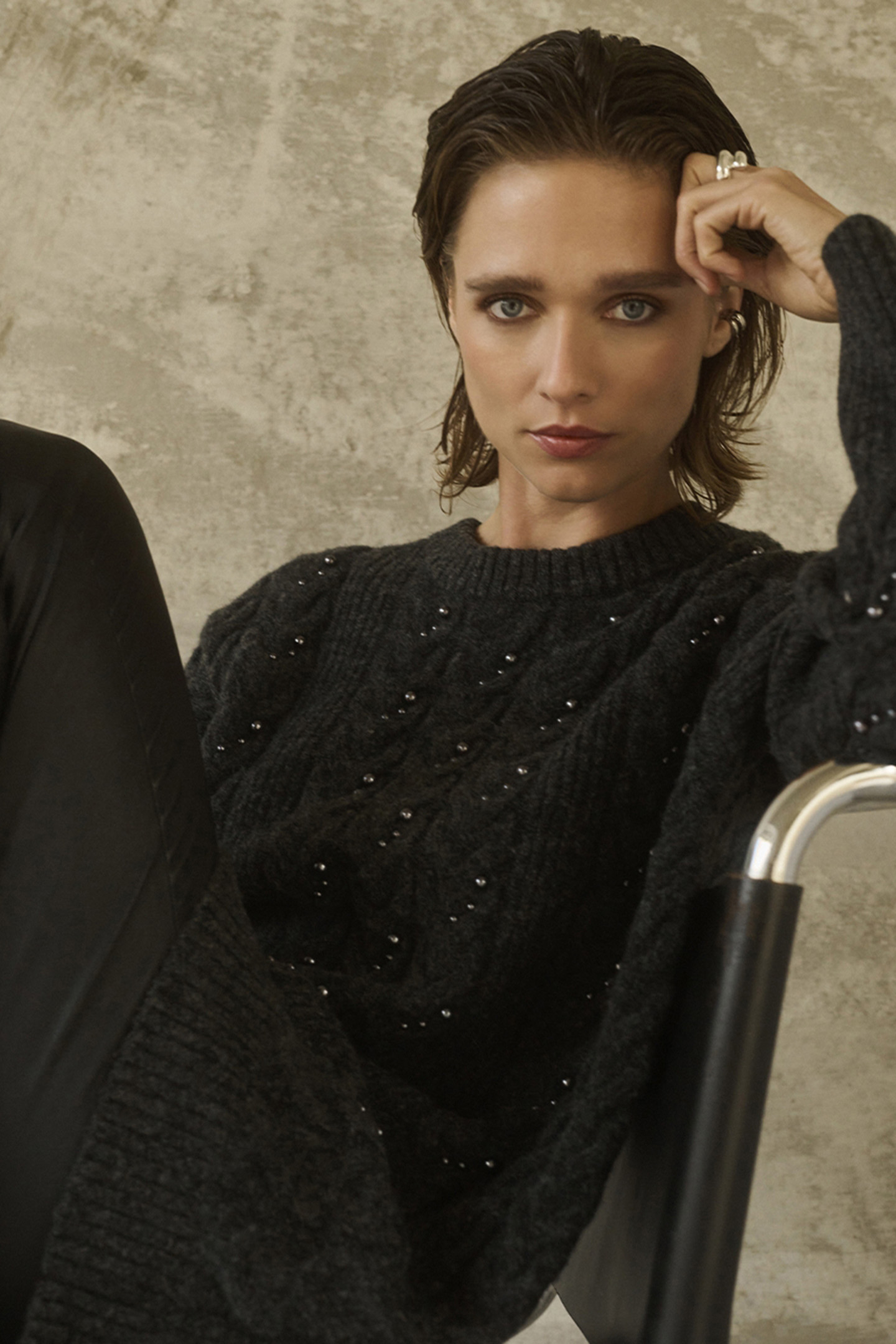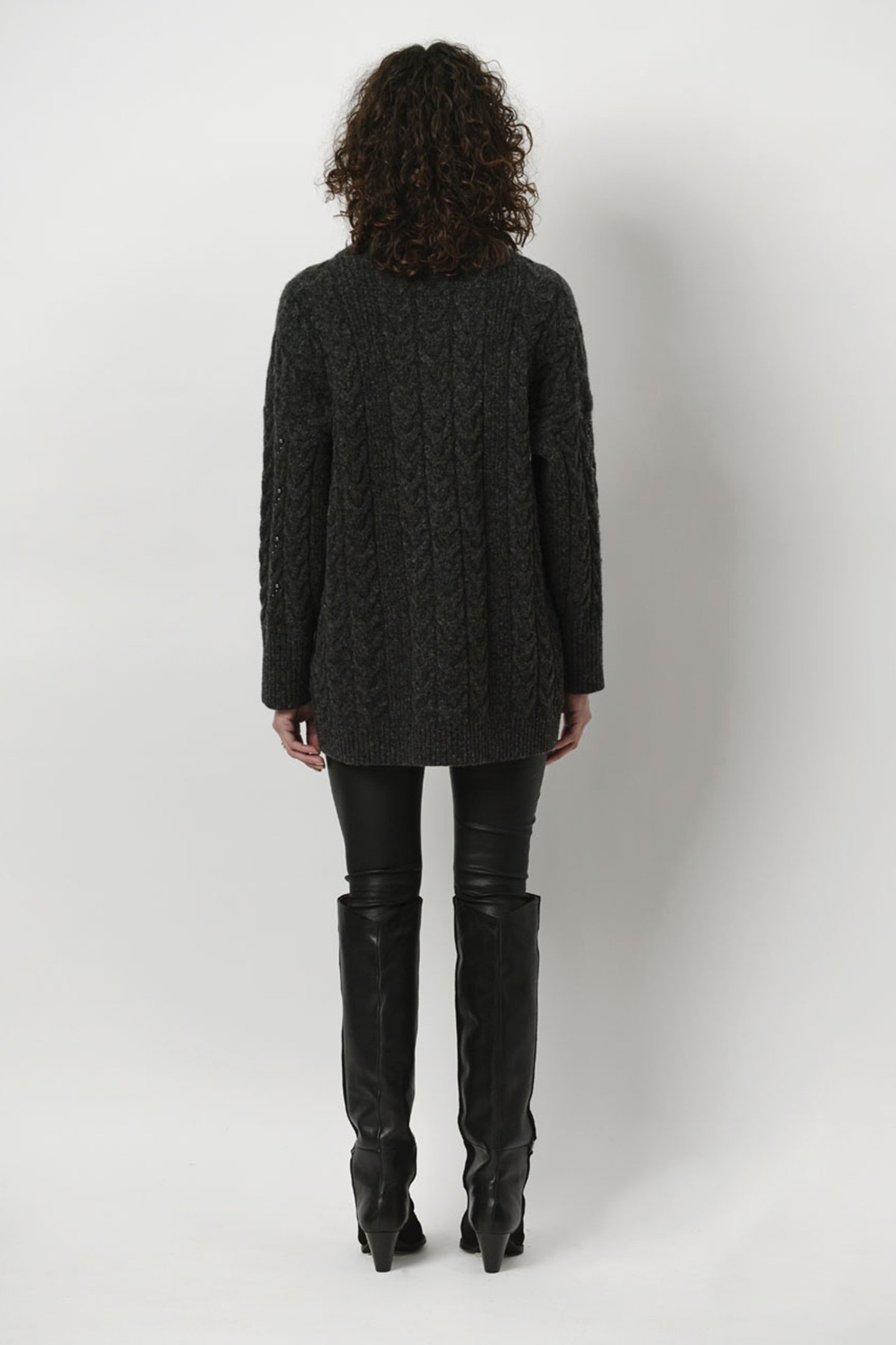 Get Fancy In This Sweater Croft In Colour Graphite. This Long Sweater Has A Relaxed Shape, A Crewneck And Long Sleeves. It Features A Cable Knit Pattern Allover Adorned With Pearls. Combine This Special Sweater With Our Suede Legging Dollman And Our Knee High Boots Sonora For A Casual But Chic Dante6 Look.