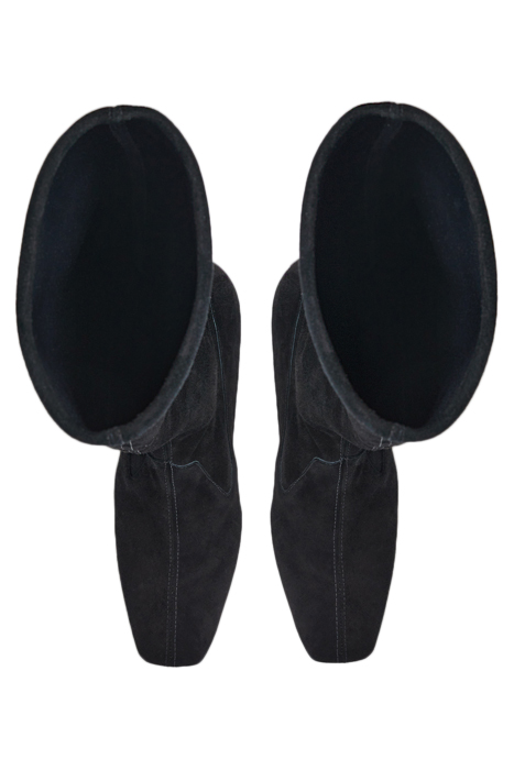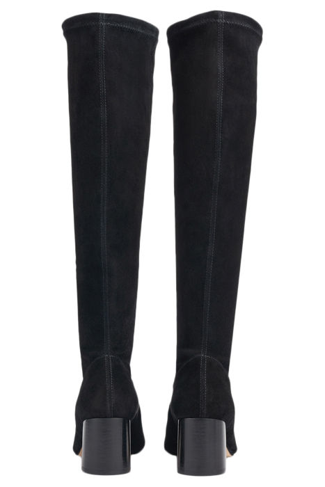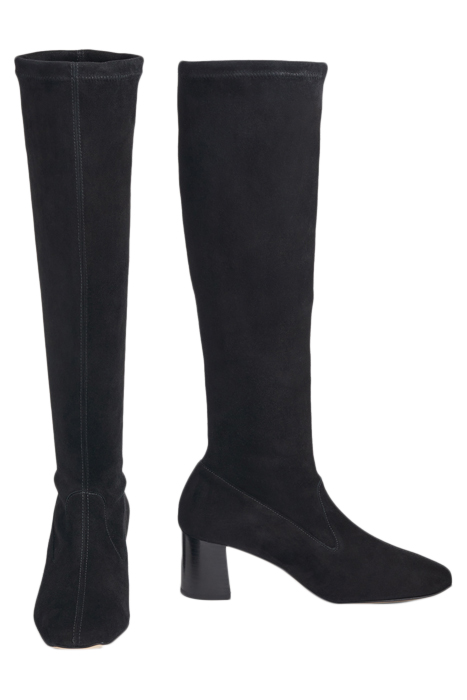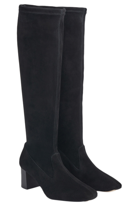 An elevated essential for any winter boot collection, our new Davina knee-boots offer a sleek look and a perfect fit. Crafted in Spain from beautiful black stretch suede, they have a square toe, a slim fit and a 60mm stacked block heel. Pull them on under winter skirts and dresses when it's time to up the winter layers.