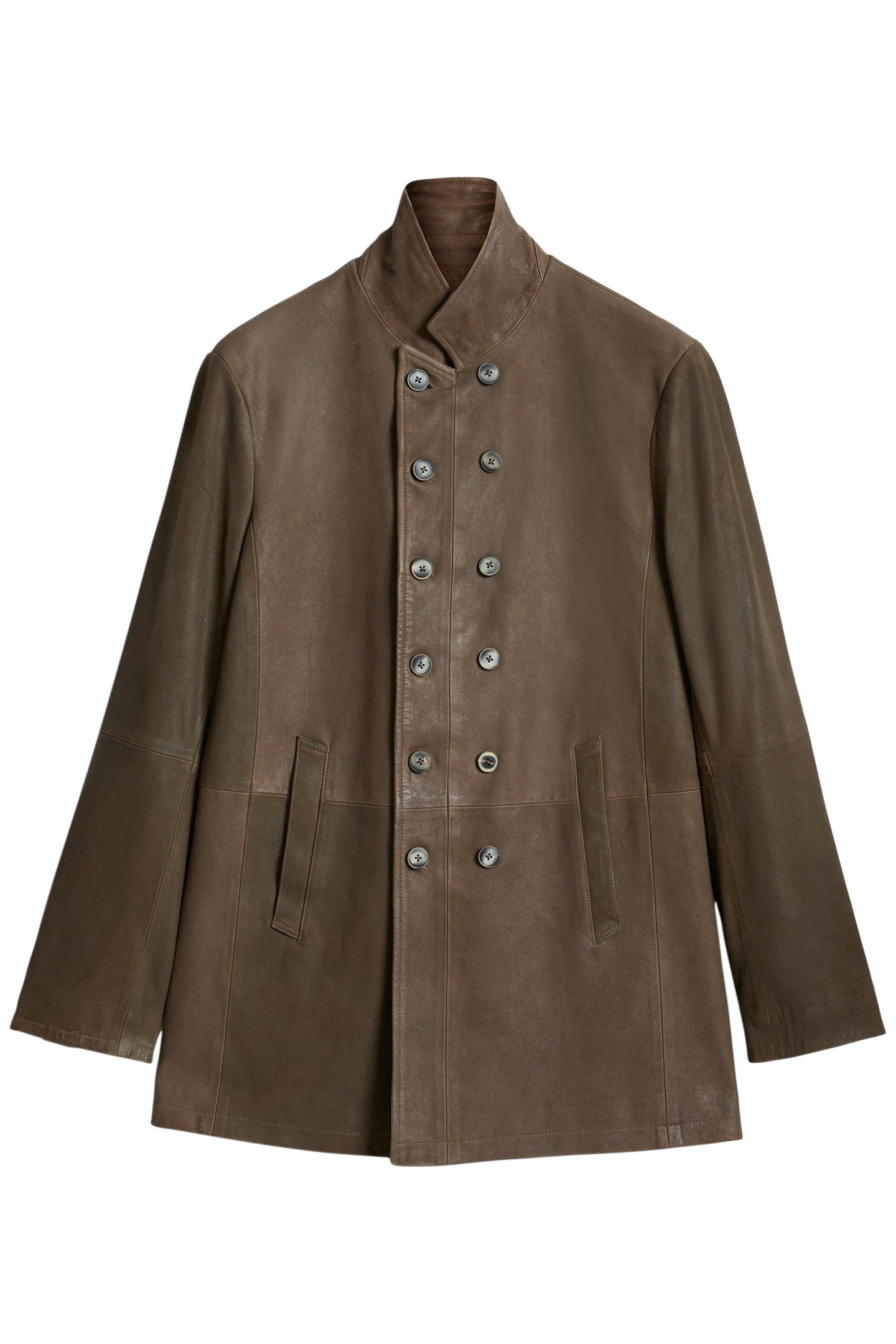 A Lighter Jacket For When You’Re In Between Seasons. Double Breasted With A Peak Lapel, This Mid-Length Jacket Features A Burnished Finish And Welt Pockets At The Hip.
