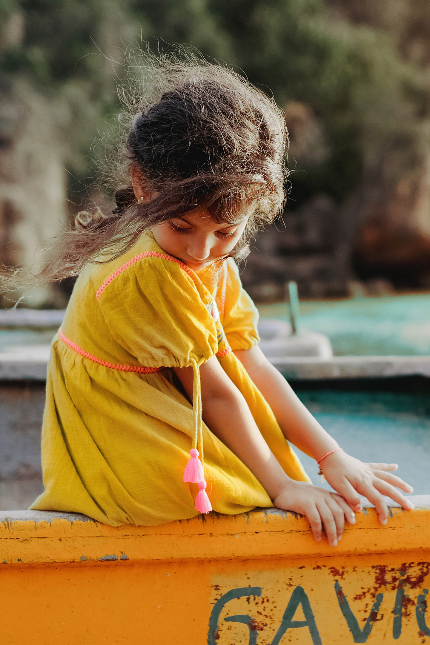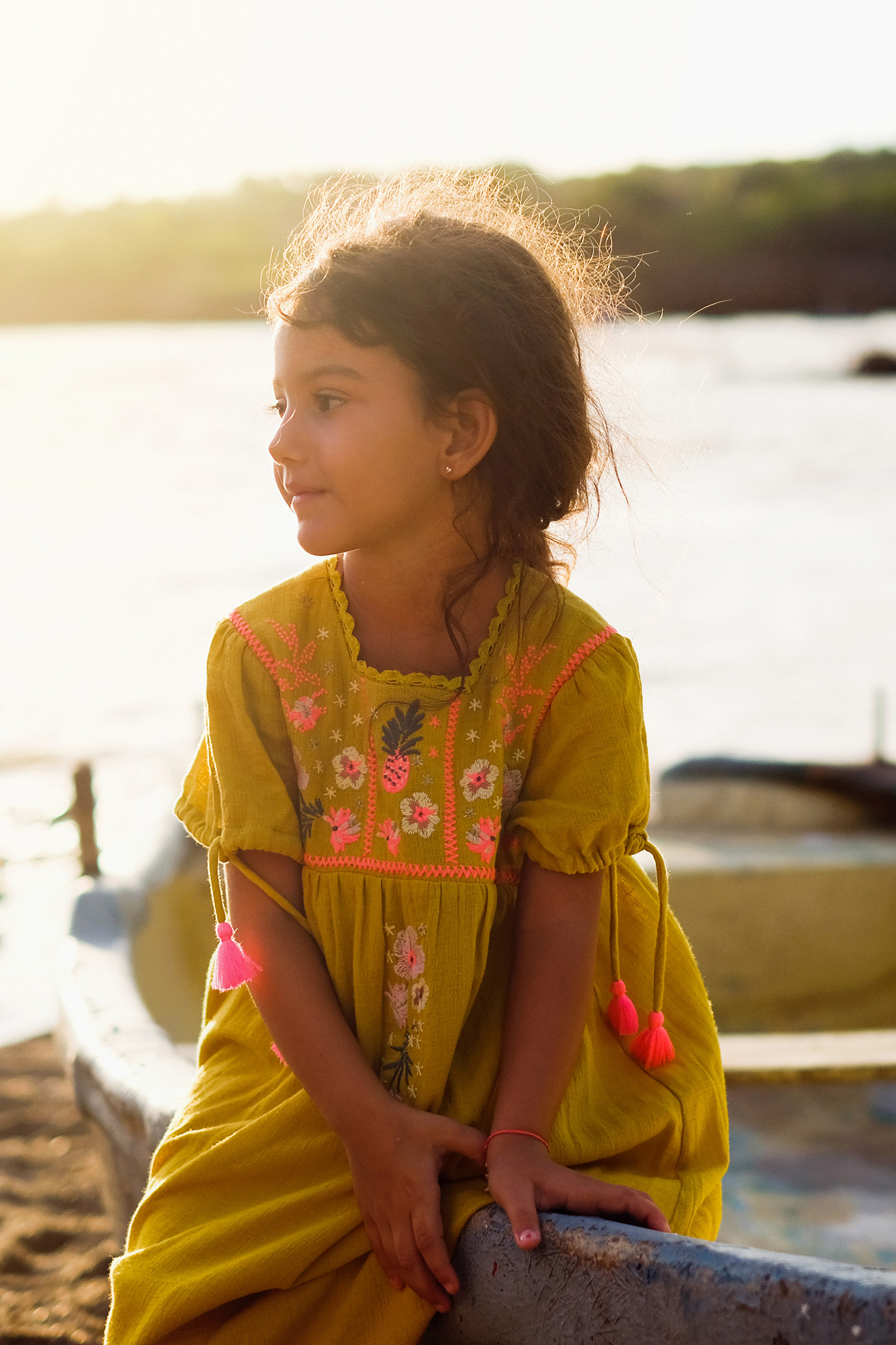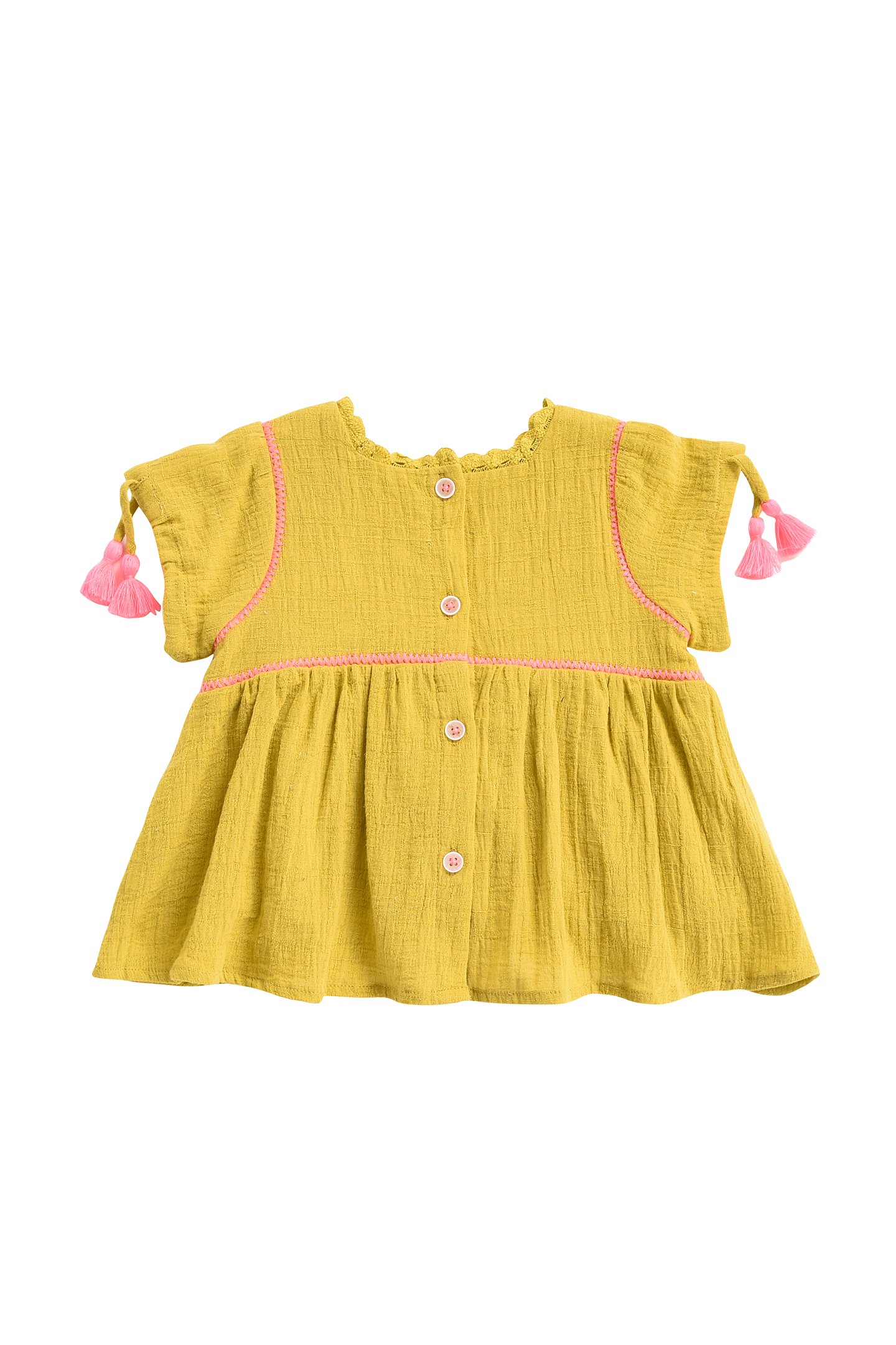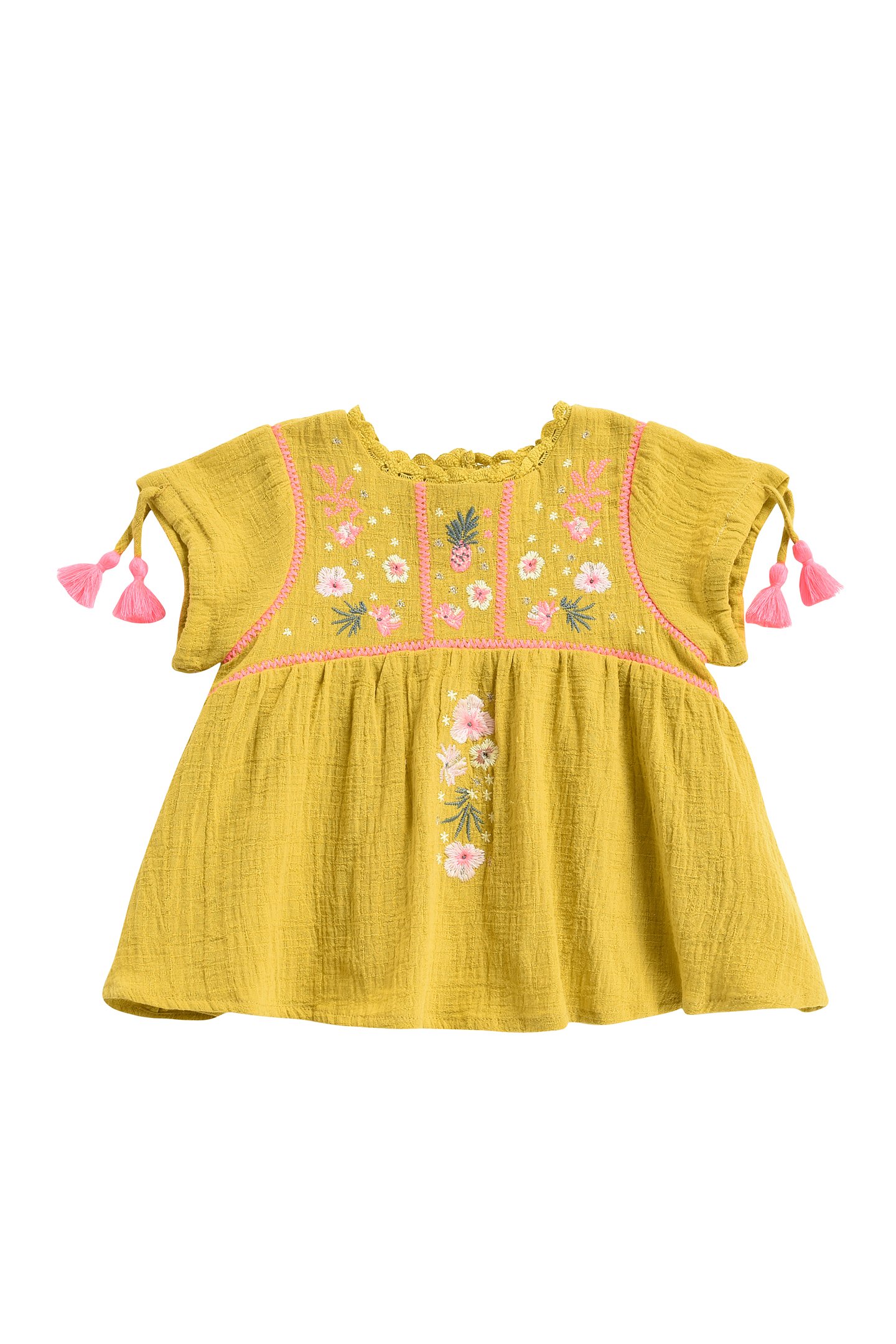 Flared, Short-Sleeved, Saffron-Colored Dress. Square Neckline Decorated With A Braid Trim. Delicate Flower And Fruit Embroideries On The Front. Little Sleeves With Drawstring Ties That End In Pink Pompoms.%%Available In Size 3 Months To 14 Years Old%%Buttoned Opening Along The Entire Top Of The Dress For Baby Models From 3-24 Months.%%Length : Between 33Cm In 3 Months And 83Cm In 14Y%%Shell: 100% Cotton, Lining:100% Cotton