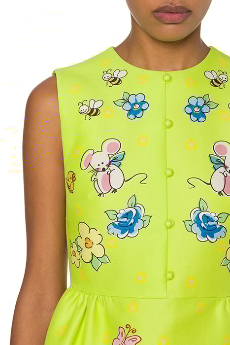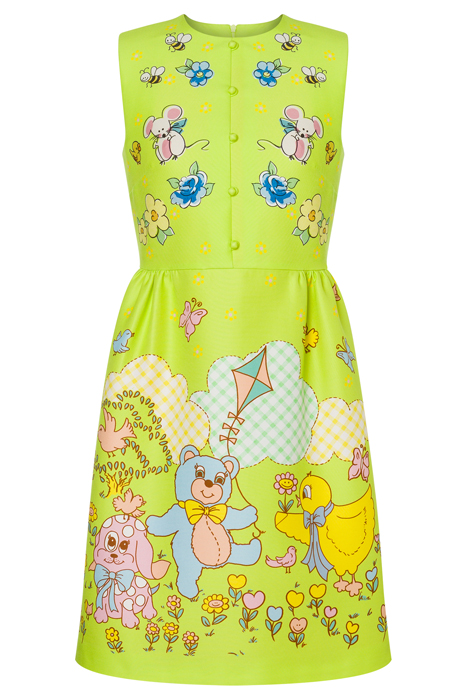 Cotton Duchess Dress With Placed Calico Animals Print And Decorative Buttons Covered In The Same Fabric.
