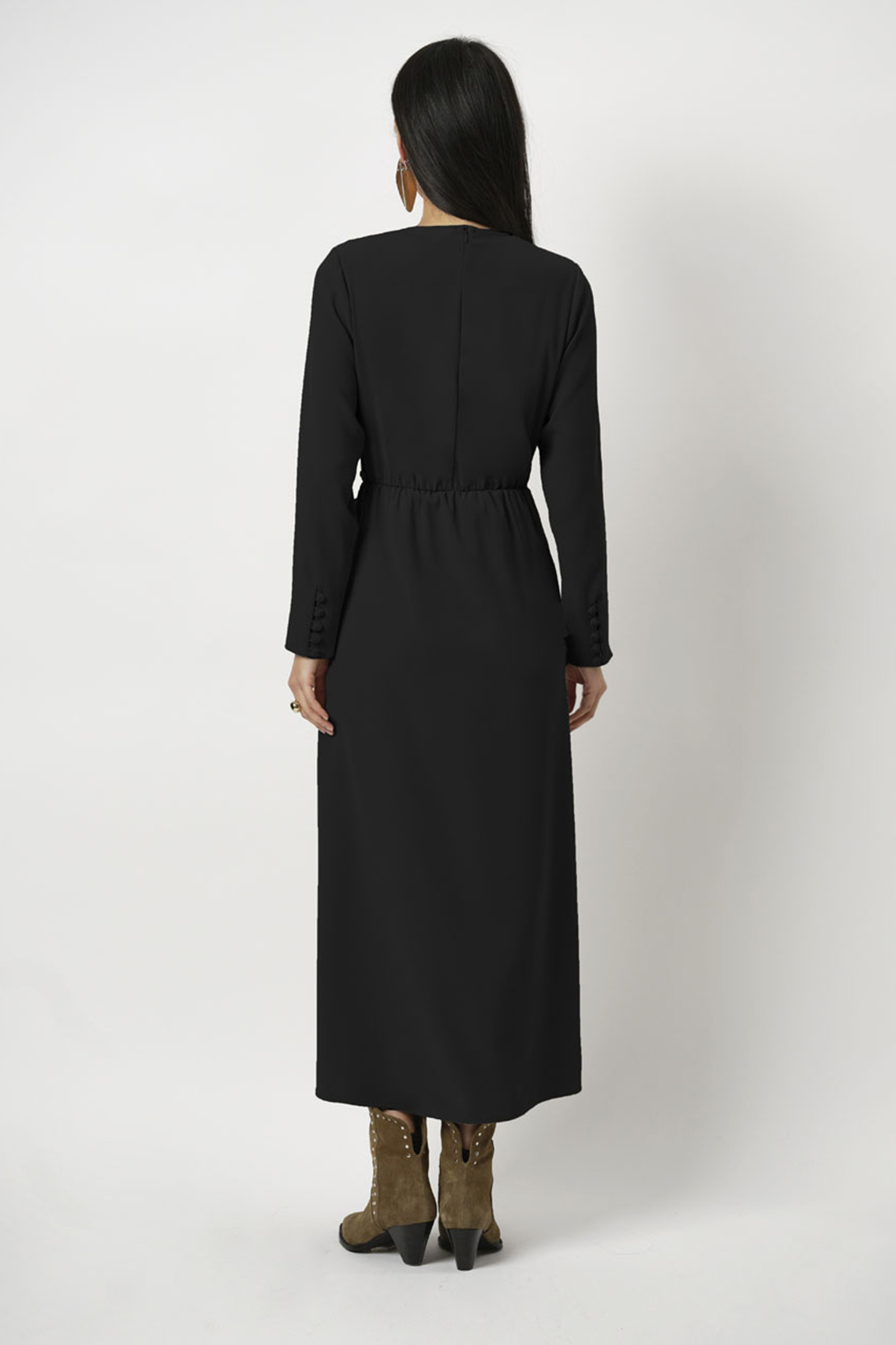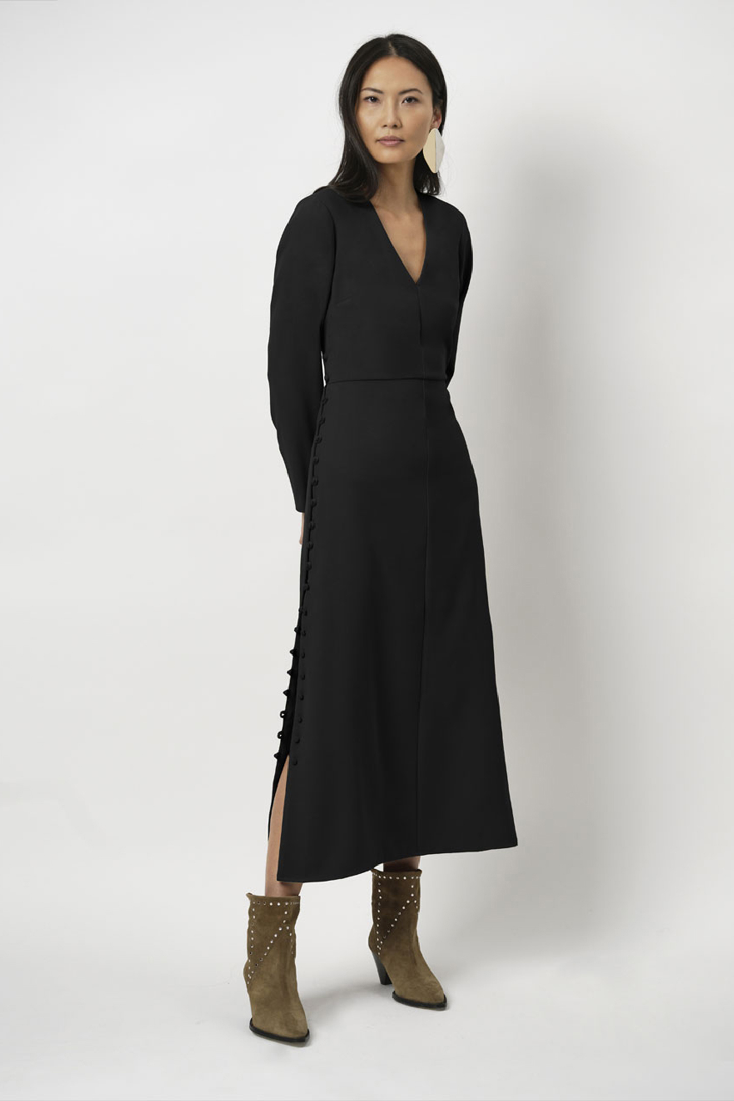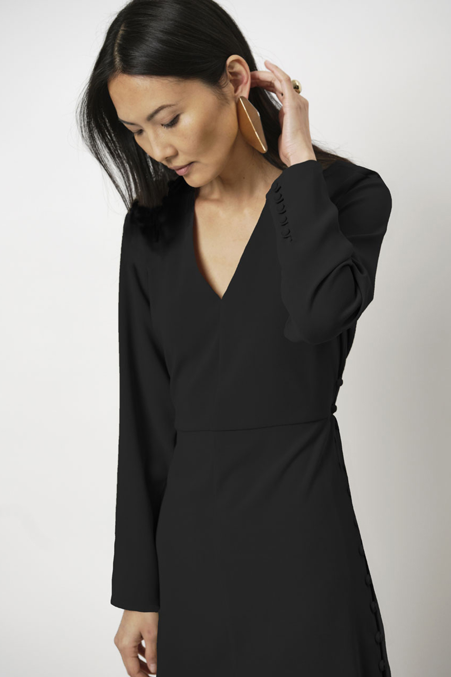 Cool Elegance With Great Details Are The Attributes Of Our Black Dress Dykoma. This Sharp Tailored Dress Has A V-Neck And Long Sleeves With Shoulder Pads. The Long Slits At The Side Seams Are Adorned With Shellfabric Covered Buttons, Adding An Air Of Playfullness And Intrigue To This Dress.