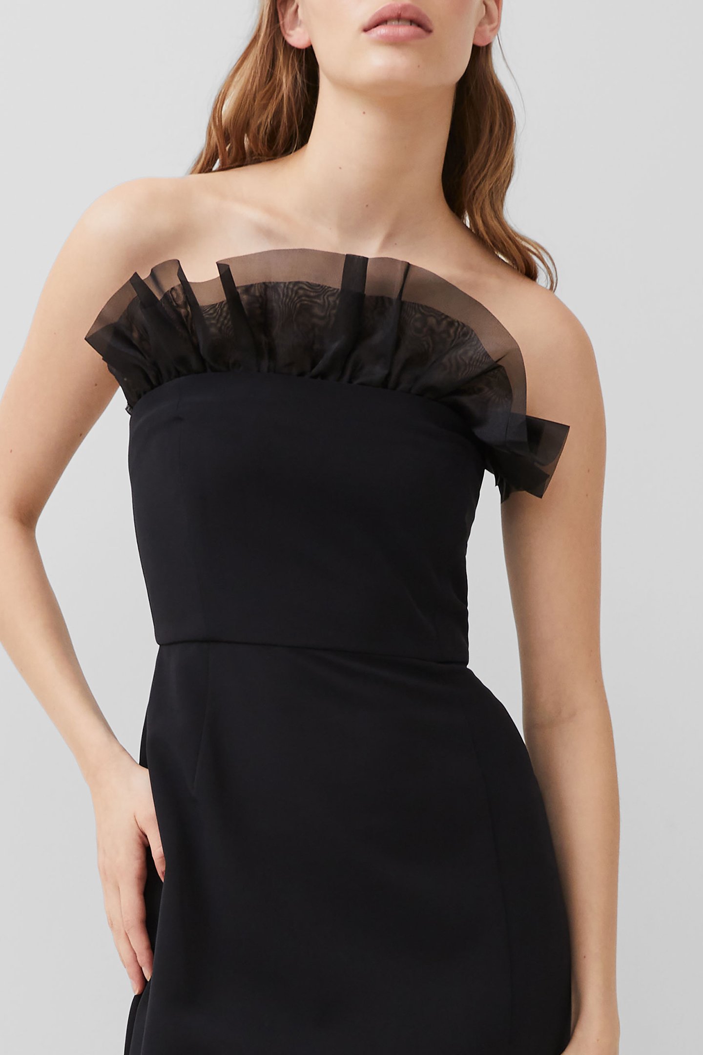 Our Echo Crepe Tulle Midi Dress Is The Epitome Of Elegance For The Season. The Smoothfabric And Strapless Silhouette Combined With The Classic Old-School Glamour Of Its Tulle Neckline Brings A Timeless Touch To Your Wardrobe. A Sultry Side Split And