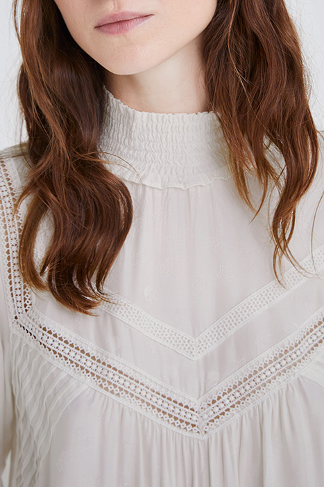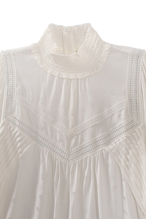 Women’S Ecru Viscose Crepe Blouse Smocked High Neck, Buttoned 3/4 Sleeves Jacquard With Rock Motif: Skulls, Stars, Crowns Lace Band Detail And Flat Stitched Pleats Invisible Zip Down Back To Fasten Straight, Flowing Fit