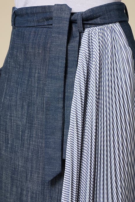 100% Cotton Slubbed Denim Midiskirt With Flared Line, Striped Pleated Poplin Side Insert, Oversized Side Pocket, Denim Sash To Tie In A Bow At The Waist