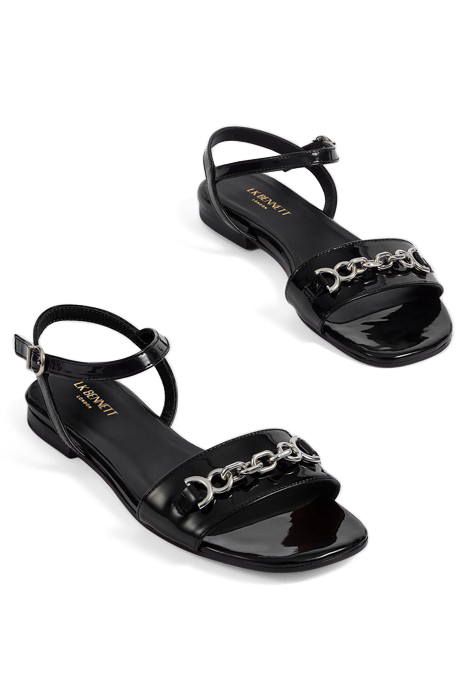 An Elevated Take On A Simple Flat Sandal, Our New Kelly Sandals Bring A Little Polish And Shine, Thanks To Their Chic Sffle Detail. Crafted In Spain From Glossy Black Patent Leather, They Have A Wide Strap Over The Toes With A Silver Sffle, An Ankle Strap With Silver Buckle, And A Flat Sole. Wear Them On Summer'S Hottest Days Or Take Them On Holiday, And Accessorise With A Pedicure.