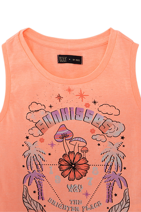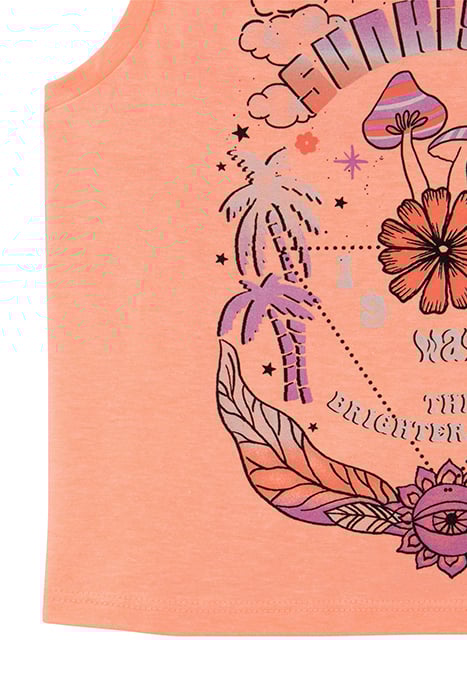 GIRLS’ NEON ORANGE VEST TOP, MUSHROOMS & PALM TREES IMAGES