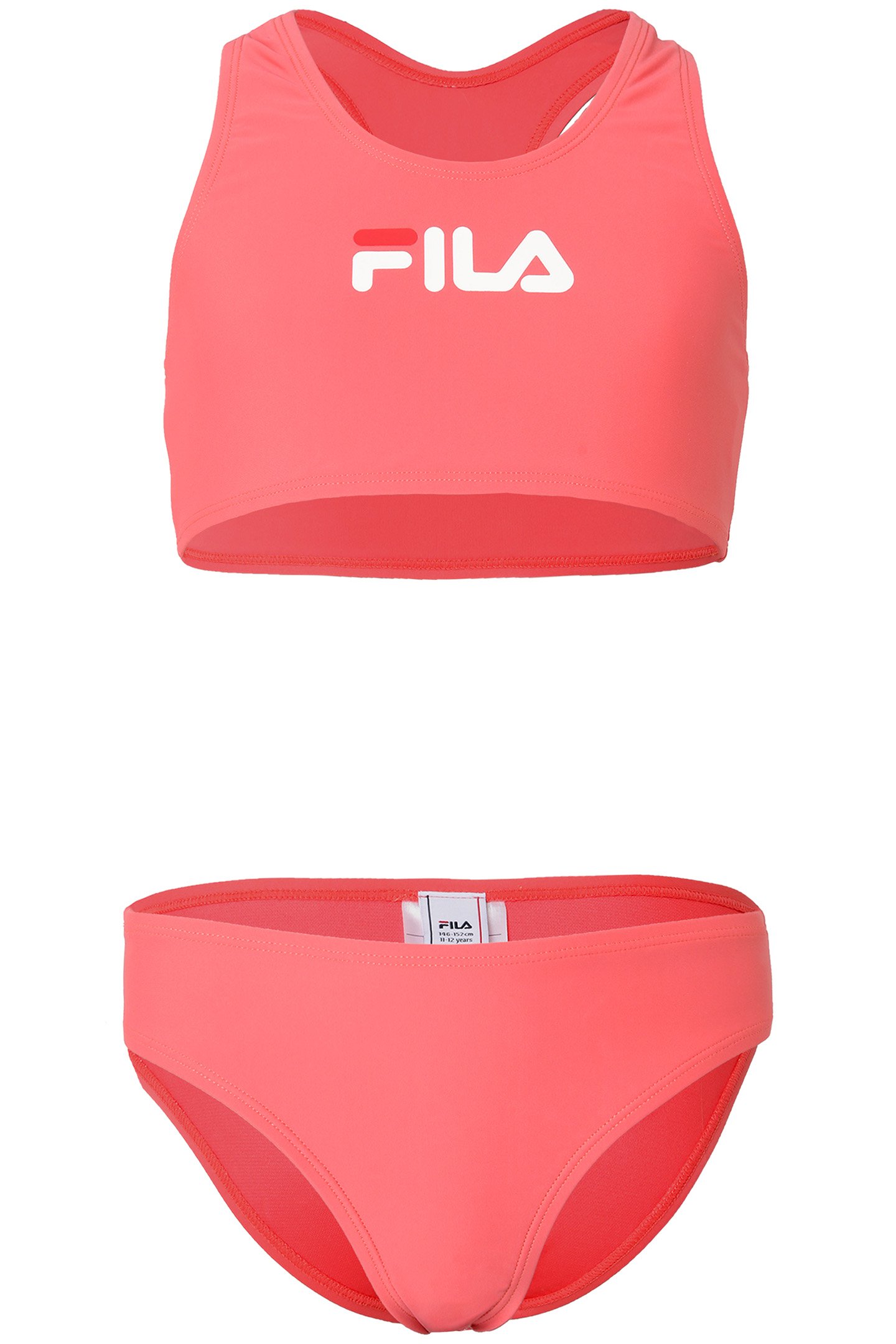 Sporty Bikini Set With A Racer Back For Teen Girls. In A Single Jersey Lycra Quality And Branded With A Large Fila Linear Logo Across Chest. Combined With A Regular Pair Of Bottoms.