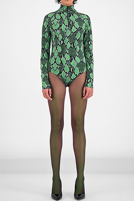 As part of our FW19 collection, we blend the past, the future, technology, and liberation. We are free travellers of space and time, and heritage is our departure point of creativity. Made from comfortable stretch jersey, the Gody is a long-sleeved bodysuit crafted from a green snakeskin printed fabric. The high-neck design has a frontal zipper closure. The bottom closure consists of small snap buttons that provide a secure fit. Wear it as a set with the Green Snake Gady Pants.