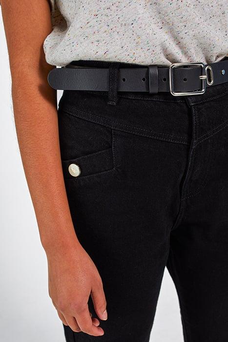 Women’s intense black slouchy jeans - 2 side pockets, 2 patch back pockets - Seams under the waistband, front and back - Zip and button fly
