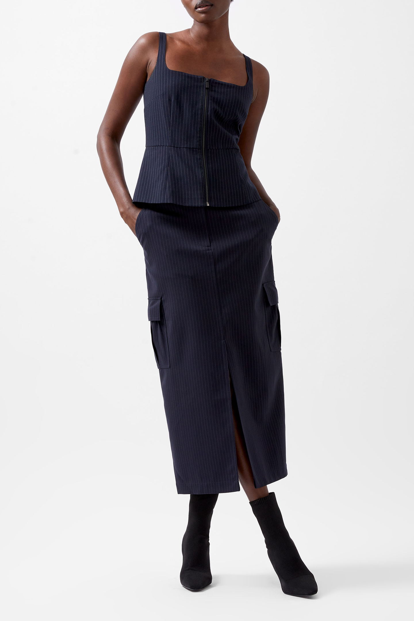 Our Hayley Pinstripe Strappy Top Nods To Modern Sophistication With A Stylish Flair. Showcasing A Pinstripe Print, This Top Boasts Modish Features, From A Square Neckline And Adjustable Straps To Front Zip-Through Fastening. A Classic Print And Chic Silhouette? Count Us In. To Co-Ordinate Your Ensemble, Wear Alongside Out Hailey Pinstripe Cargo Skirt.