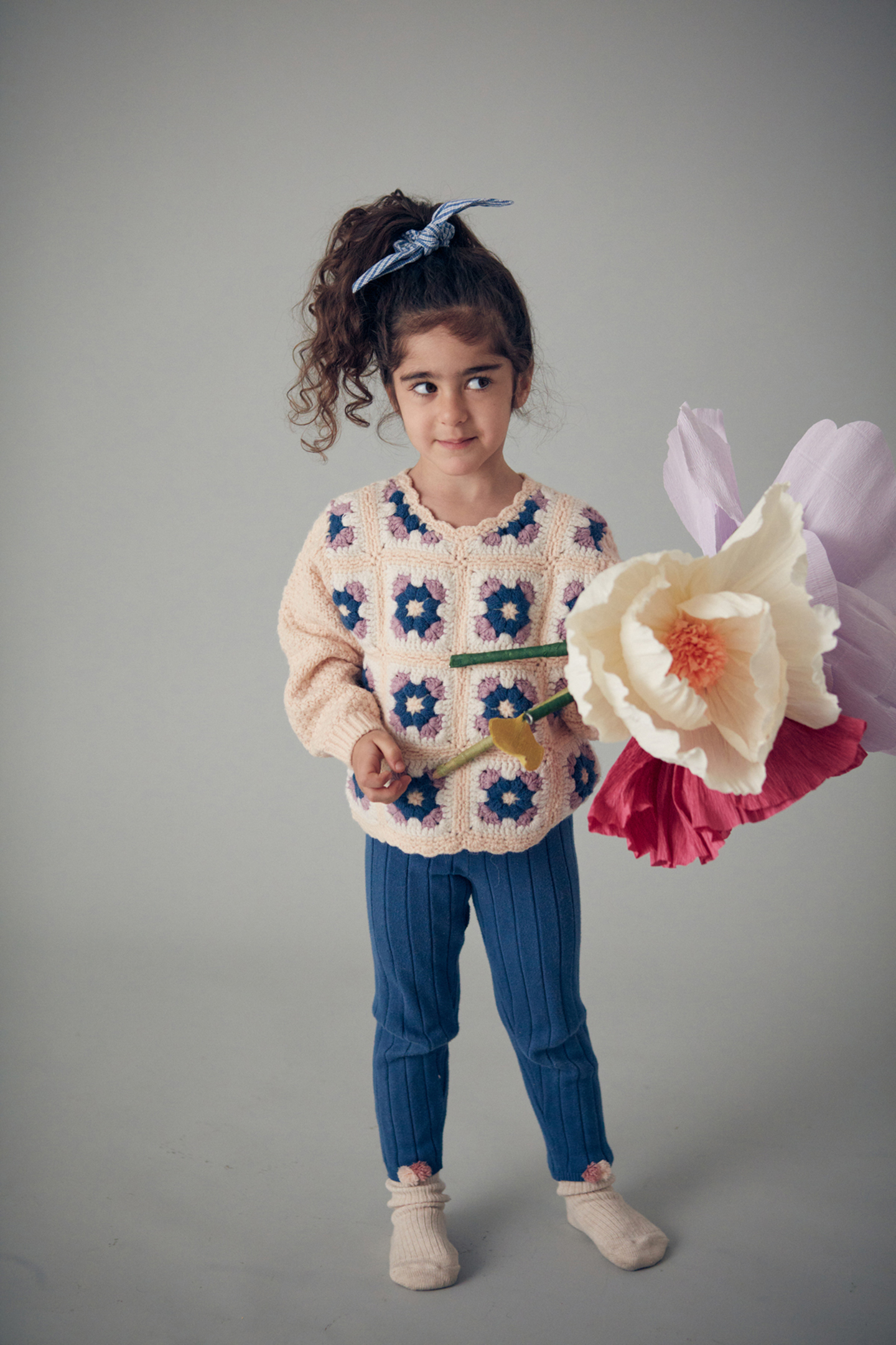 - Knitted Sweater With Handmade Crochet Floral Pattern At The Front.