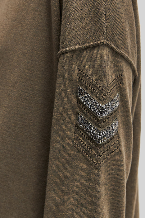 KHAKI HERRINGBONE BOAT-NECK JUMPER WITH JEWELS AND STITCHES