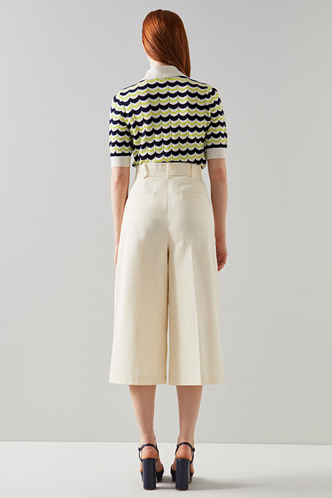 The Lena trousers are crafted from cream cotton. They sit on the waist with a tie belt, have side pockets, back welt pockets, a wide cut with pressed centre creases and a cropped ankle length.