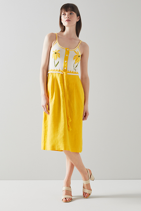 Vintage-Inspired And Designed With Sunshine In Mind, Our Lucia Dress Transports You To The French Riveria In Times Gone By. It Has A Cream Camisole Top Embroidered With Yellow Flowers And Has Matching Straps, Buttons And A Drawstring Tie Belt. It Then Falls To A Knee Length A-Line Skirt With Side Pockets And A Single Pleat To The Back. Wear It With A Strappy Pair Of Heels And Carry A Basket To Really Play Up Its Vintage Charm.