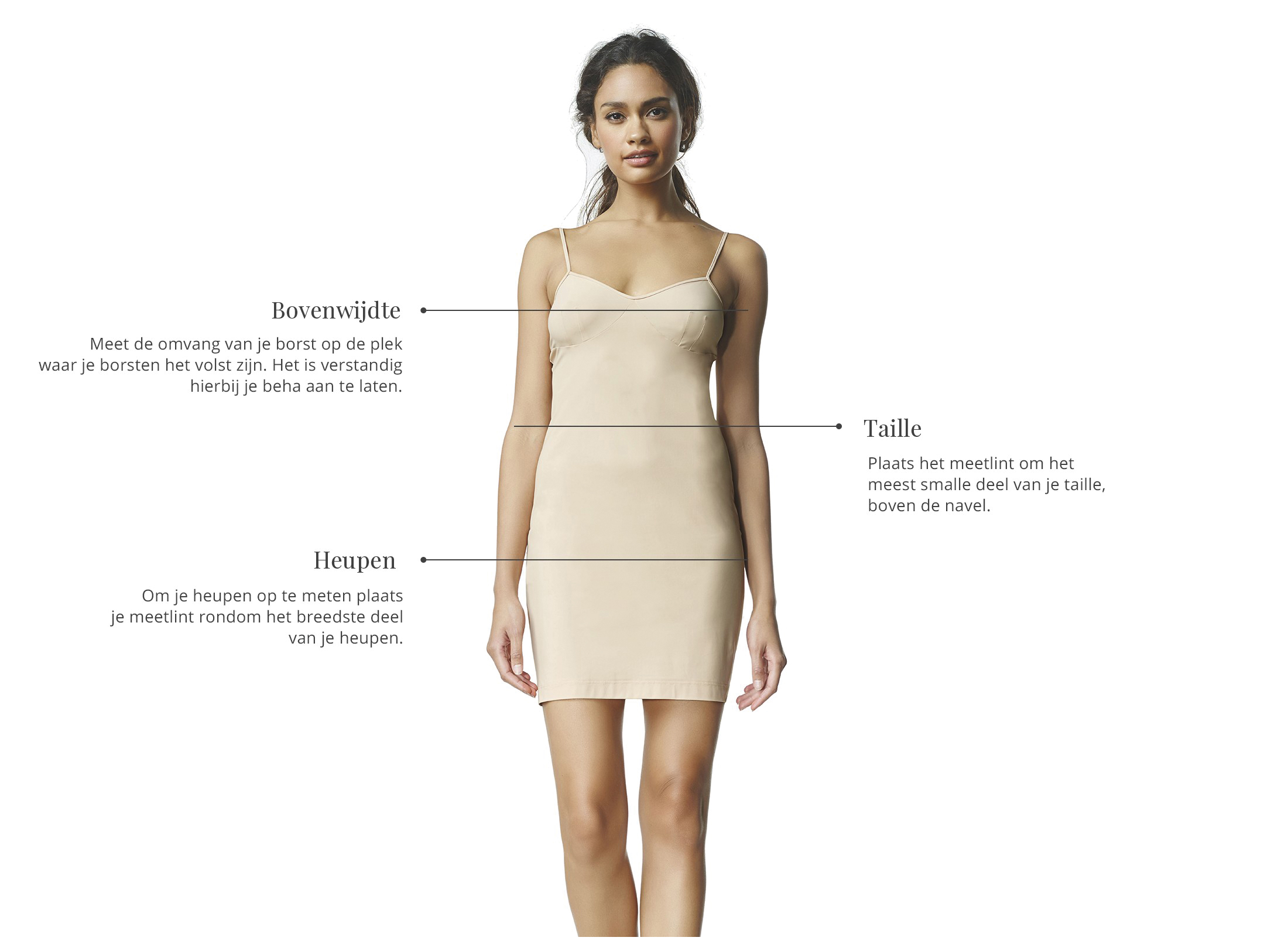 Om erachter te komen welke maat je hebt meet je jezelf op zoals op de afbeelding getoond wordt. Zorg ervoor dat je de centimeter- of de inchtabel gebruikt.