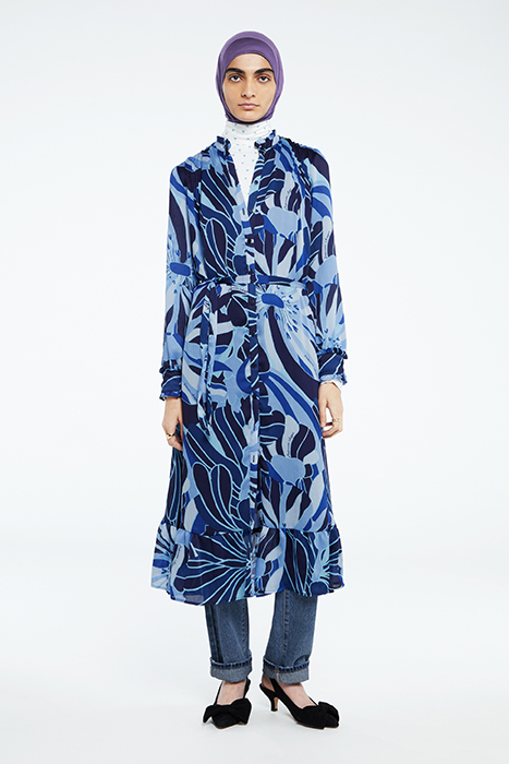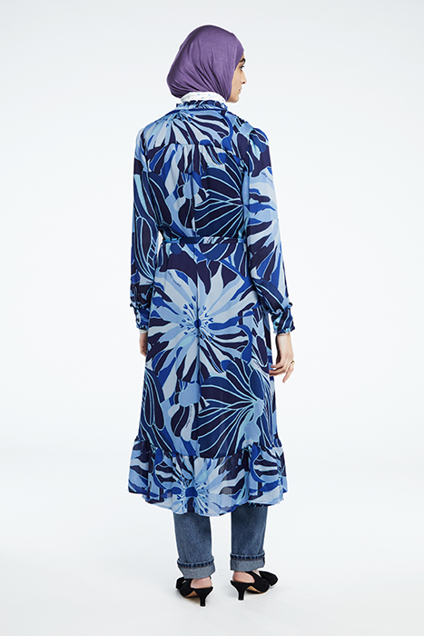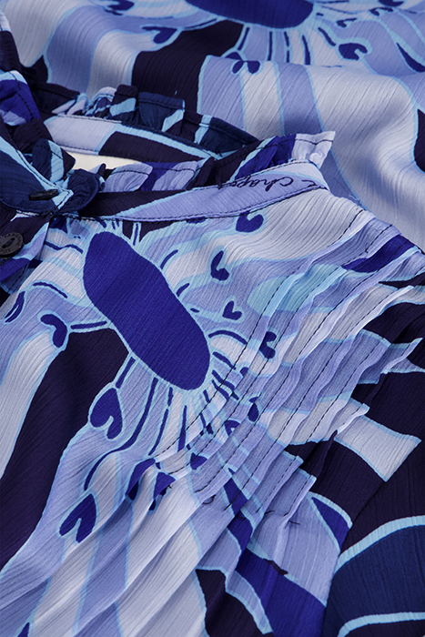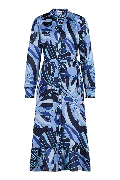 Long-Sleeved Midi Dress With Raised Board With Ruffle And Gold Fabienne Chapot Button. Marina Dress Has A Bow Belt, Full Length Buttons And A Beautiful All Over Riviera Print. This Dress Is Made From Rpet, 100% Recycled Polyester. Find Out In The Care Label How Many Bottles Were Recycled For Your Item.