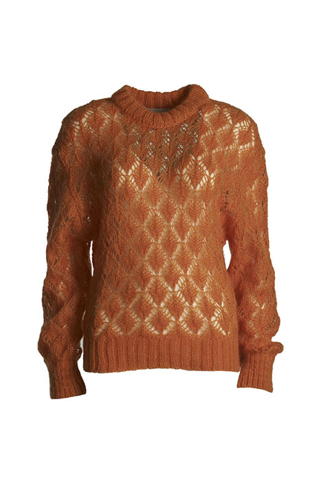 50% Superkid Mohair – 32% Polyamide – 18% Merino Wool extra Fine. Ajour gebreide trui in een zachte mohair kwlatieit. De trui heeft een ronde hals, manchetten en een boord aan de onderkant. De trui valt ruim, maat S heeft een lengte van 59 cm en een borstwijde van 114 cm.