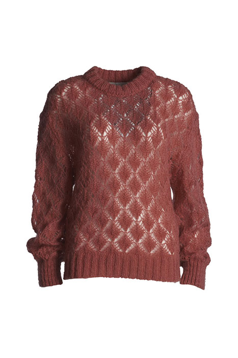 50% Superkid Mohair – 32% Polyamide – 18% Merino Wool extra. Fine Ajour gebreide trui in een zachte mohair kwlatieit. De trui heeft een ronde hals, manchetten en een boord aan de onderkant. De trui valt ruim, maat S heeft een lengte van 59 cm en een borstwijde van 114 cm.