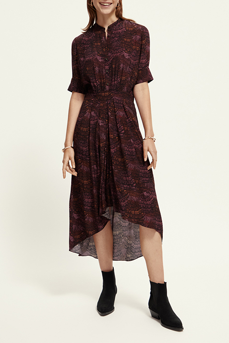 Introducing the stunning Midi Dress with High-Low Hem from Scotch & Soda, available in a rich feather bordeaux color. This elegant dress exudes sophistication and style, making it the perfect choice for any special occasion or evening event.