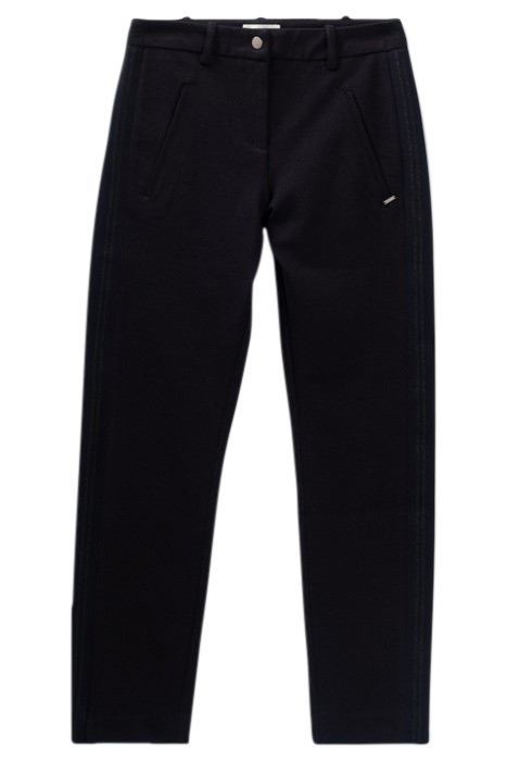 Women’S Navy Viscose, Polyamide, Elastane And Polyester Knit Trousers Slim Fit, Mid-Waist 2 Piped Side Pockets, Belt Loops On Waistband Semi-Plain Fabric, Striped Side Bands Zip And Press Studs To Fasten