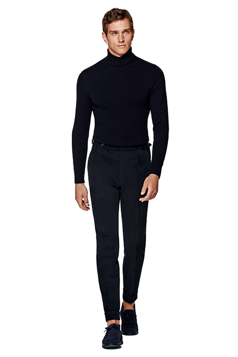 These Navy Vigo Trousers Are Tailored To A Slim Fit With A Mid-Rise Waist And Feature A Single Pleat, An Off-Centered Waistband, Winged Side Adjusters, And A 5 Cm Turn-Up.