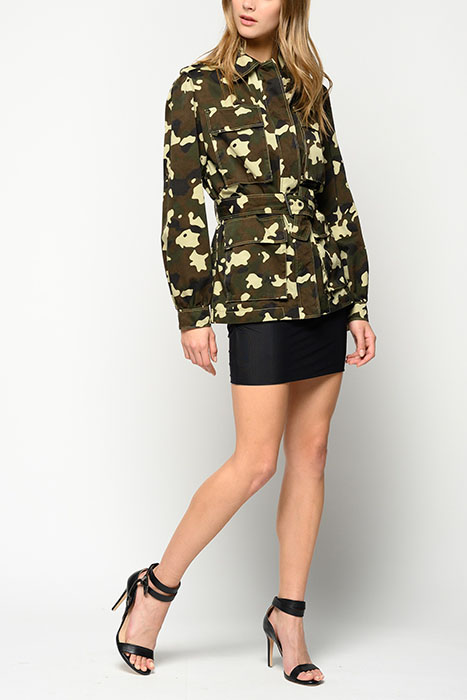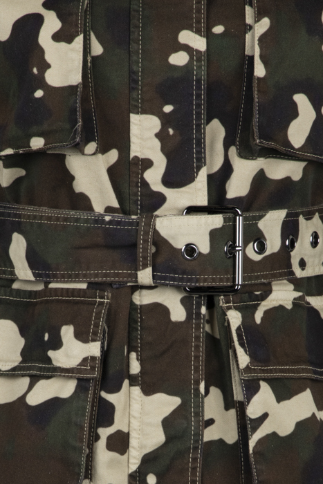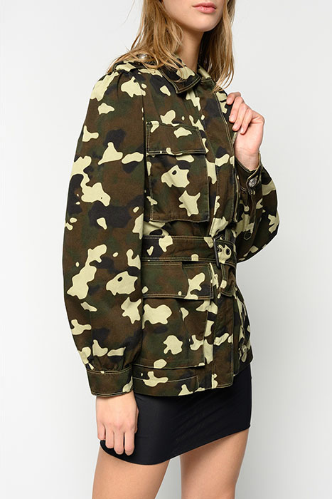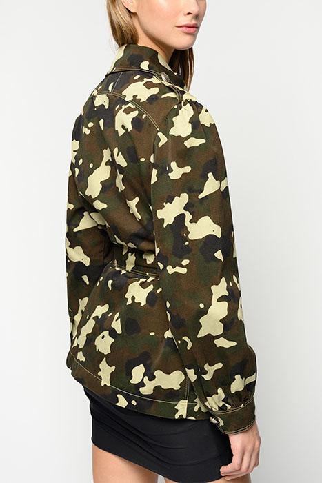 Field jacket in cotton drill with camouflage print with shirt-style collar, breast pockets and bellows pockets on front. Tabs on the shoulders, long sleeves with cuffs at the bottom, belt loops at the waist and matching fabric belt with metal buckle. Covered fastening on front. Model is 175cm tall and wears a size 40.