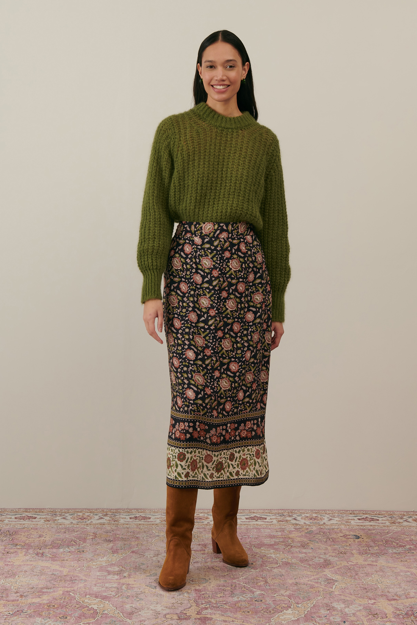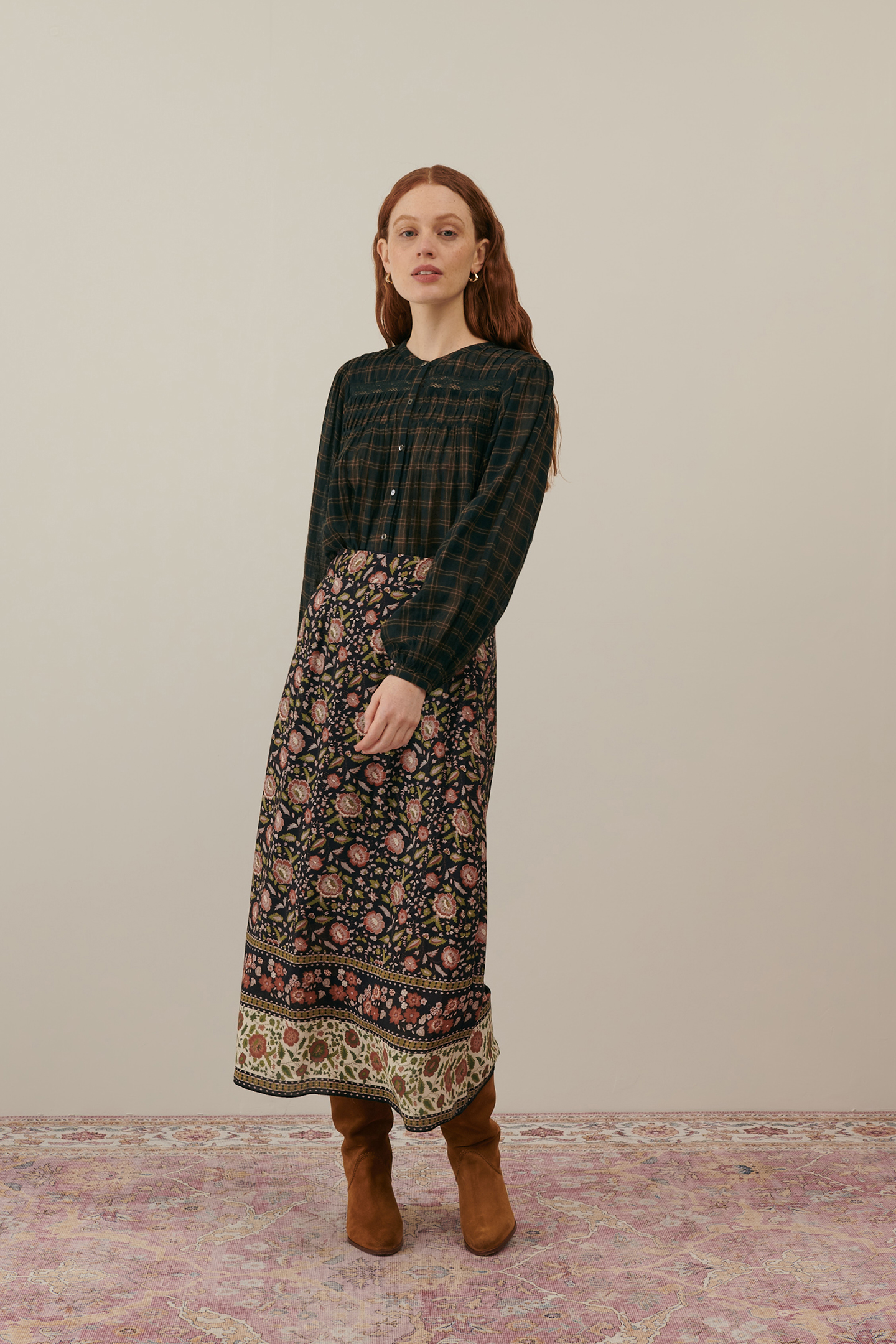 The Indian-Inspired Floral Long Skirt Of The Fall-Winter Collection! We Love Its Flowy Drop And The Frieze Detail At The Bottom.