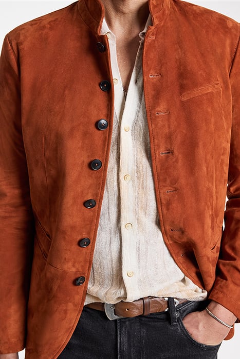 Introducing The Lassen Jacket, A Masterful Blend Of Modern Tailoring And Vintage Flair. This Slim-Fit Jacket Is Distinguished By Its Multi-Button Closure That Cascades Down The Front, Creating A Statement Silhouette. Constructed From Luxurious Goat Suede, It Features A Stand Collar That Lends A Refined Touch To Its Overall Appearance. Wear It With Jeans And A Band Tee To Enhance Your Everyday Style It Unique Charm And Supple Texture.