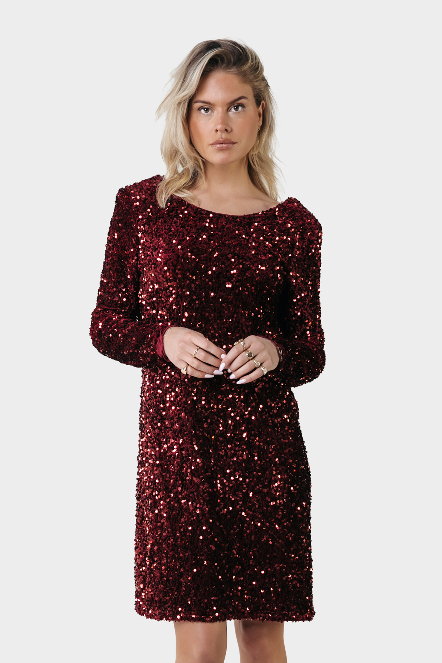 TINA SEQUINS STRAIGHT DRESS LS WARM BORDEAUX