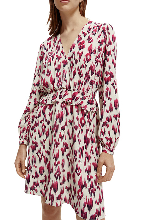 Introducing the Wrapped Short Dress in Brushed Ikat Cherry Pie by Scotch & Soda, a stunning piece that effortlessly combines style and comfort. This dress features a unique brushed ikat cherry pie print that adds a playful and vibrant touch to your wardrobe.