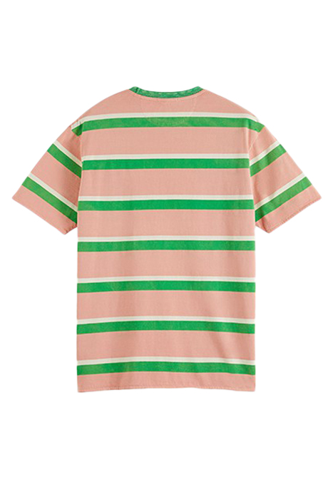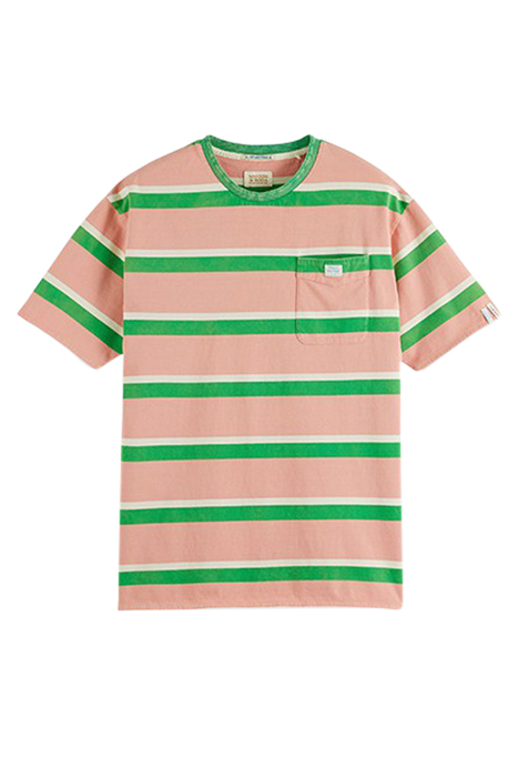 Introducing the Scotch & Soda Yarn Dye Stripe Tee in a vibrant pink and green stripe design. Crafted from high-quality materials, this tee exudes a casual yet stylish vibe that is perfect for everyday wear. The contrasting stripes add a fun pop of color to your outfit, while the classic crew neckline and short sleeves ensure a comfortable fit. Pair this tee with your favorite jeans or shorts for a chic and effortless look. Upgrade your wardrobe with this must-have piece from Scotch & Soda.